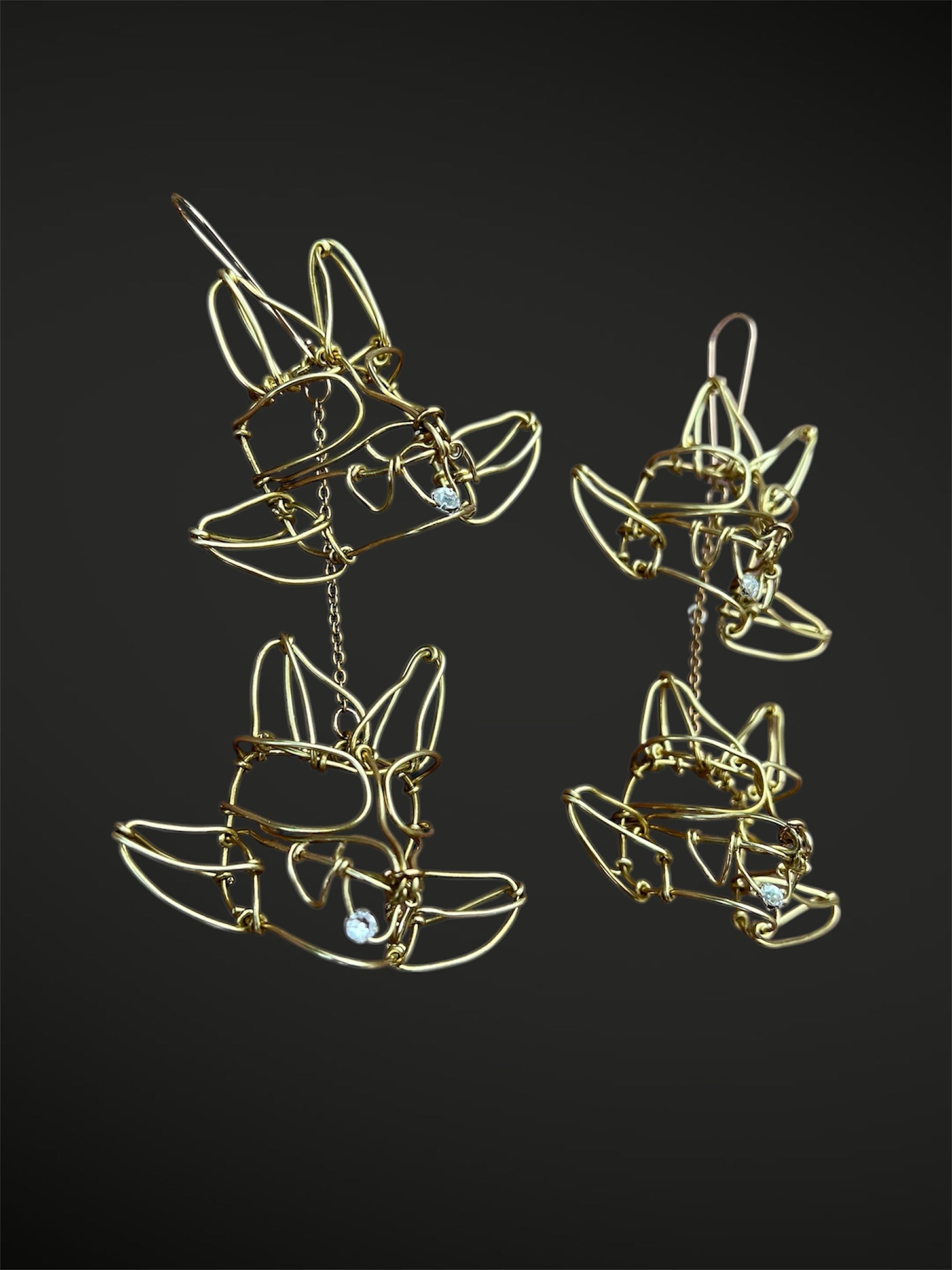 Inspired by the vibrant spirit of the vejigantes carnival in Ponce, Puerto Rico. El Carnaval earrings reinterpret this iconic tradition through a contemporary lens. Handcrafted from manipulated bronze wire, the design evokes movement and festivity, while rose montees add subtle flashes of light and color. The result is a sculptural piece that bridges cultural heritage and modern artistry, celebrating rhythm, transformation, and bold expression.